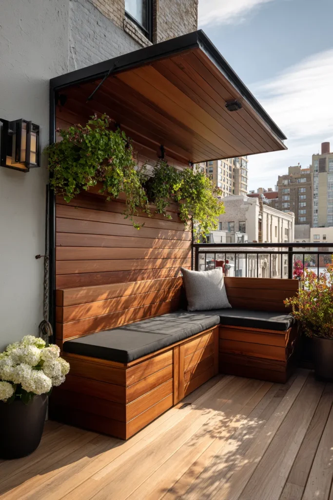 Marine-grade plywood seating with integrated storage transforms dead corner space into the highest-value real estate on apartment patios—providing comfortable seating for 4-6 people, weather-resistant storage for 200+ liters of cushions and accessories, and architectural permanence that makes small patios feel intentionally designed rather than haphazardly furnished.