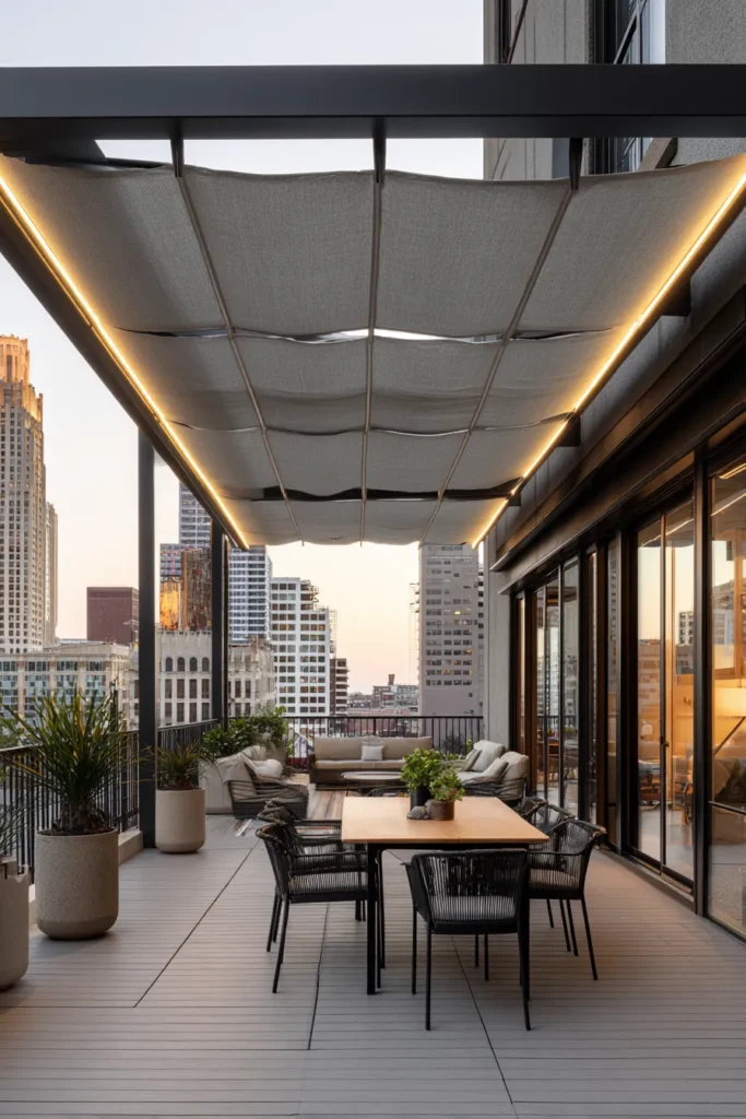 Designer’s Secret: Install your fixed canopy beams running east-west, not north-south. This orientation creates natural shade corridors during peak UV hours (10 AM–2 PM) while allowing oblique morning and late afternoon light to penetrate—critical for maintaining healthy circadian rhythms in apartment dwellers who spend 90% of waking hours indoors.