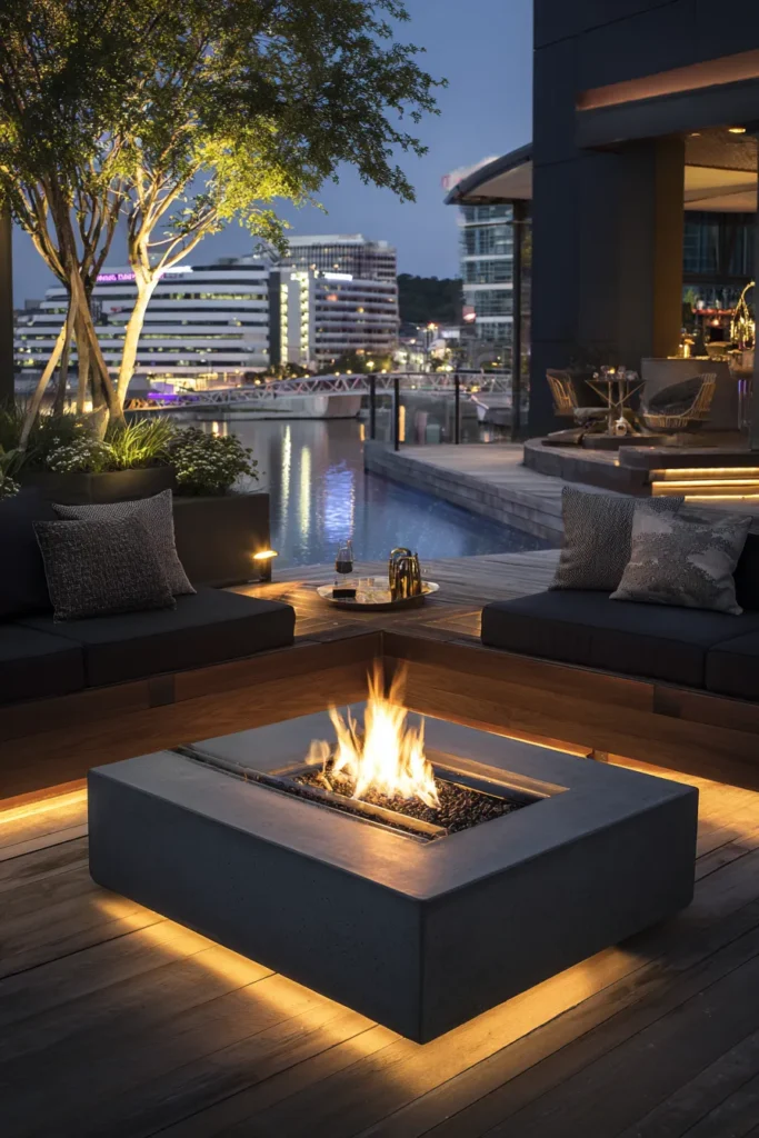 Designer’s Secret: Position fire features at coffee table height (400-450mm) rather than the ground-level placement most manufacturers suggest. This elevation brings flames into primary sightlines when seated, creating intimacy and focal point drama that ground-based installations lack. The higher placement also improves heat distribution—radiating warmth at torso level rather than ankle level where it’s least effective for human comfort.