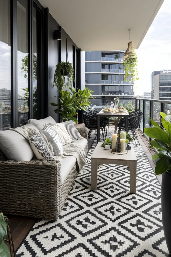 Designer’s Secret: Contradict the “bigger is better” instinct. On small apartment patios (under 15 square meters), use two smaller rugs (1800mm x 1200mm each) to define separate zones—dining and lounging—rather than one large rug that consumes the entire floor plane. This strategy creates the perception of abundant space by establishing distinct “rooms” rather than a single undifferentiated surface.