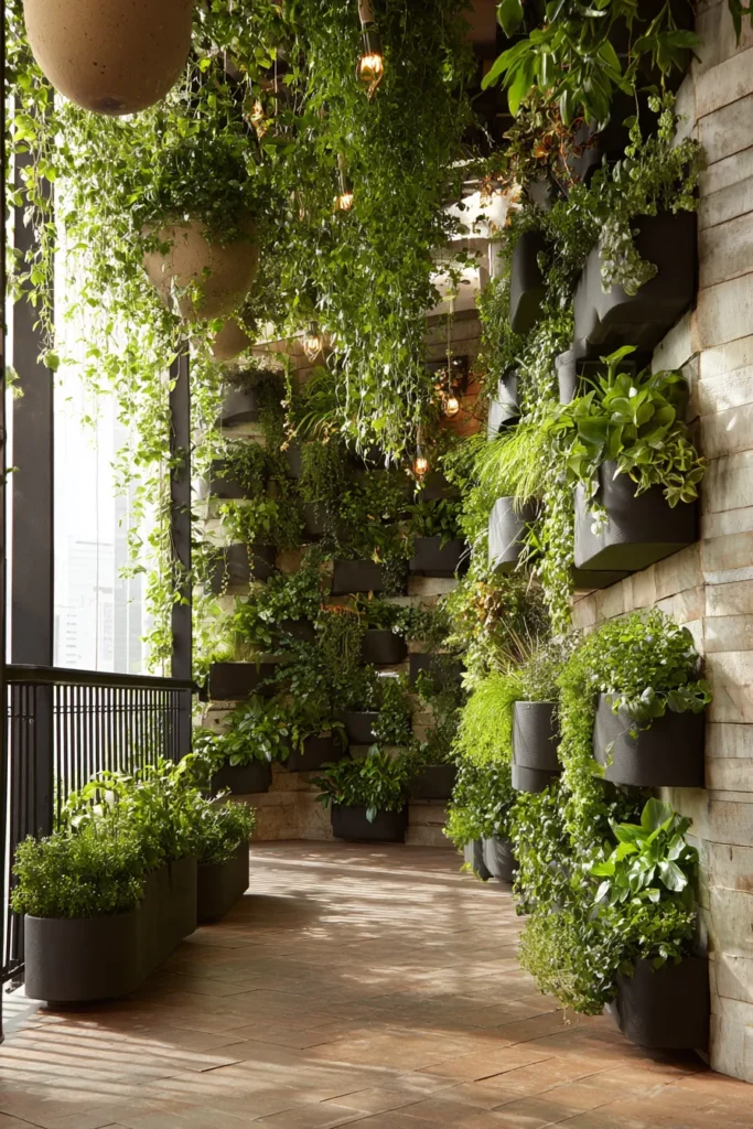 Designer’s Secret: Everyone positions vertical gardens against railings for “privacy,” but this blocks your view and creates maintenance nightmares. Mount them perpendicular to your sight line on side walls instead. This frames your view rather than blocking it, and creates a dynamic layered effect when you’re seated. Supplement lower zones with self-watering railing planters for herbs—the steel-look options integrate seamlessly.