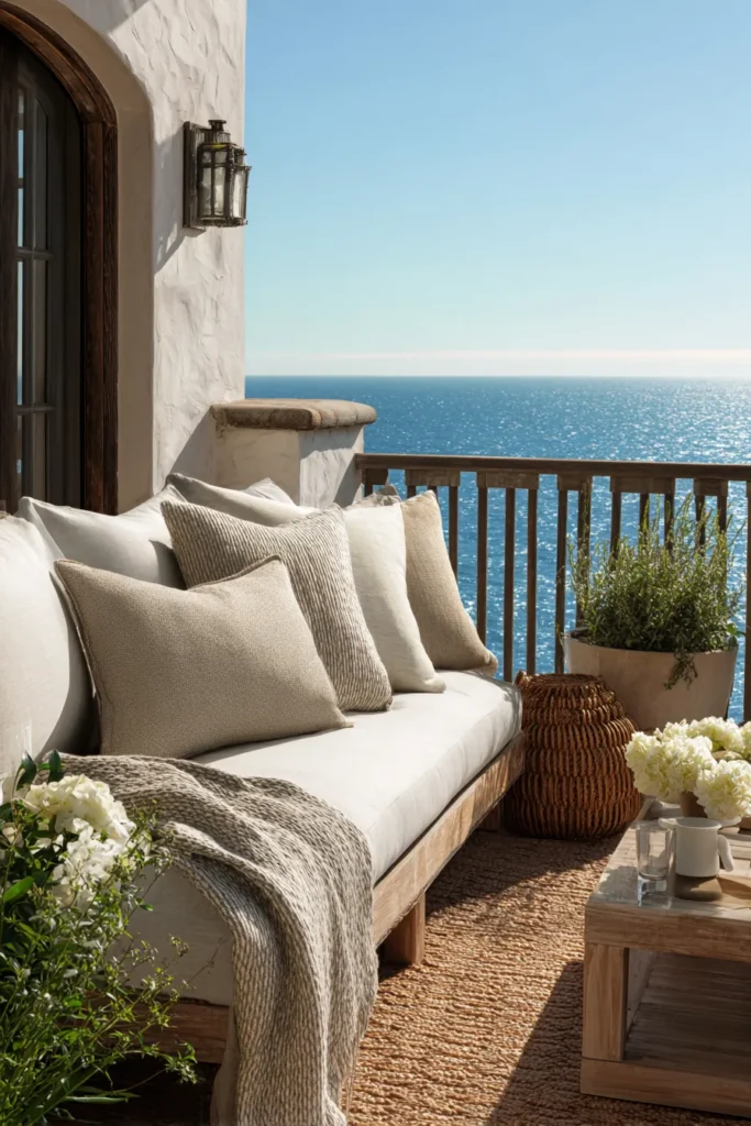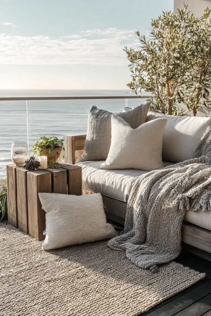 Designer’s Secret: Rug sizing ruins more balcony designs than any other single error. Your rug should extend minimum 18″ beyond all furniture edges to create a cohesive “room” effect. For a 6-foot-wide balcony with a 48″ loveseat, you need minimum a 6×9 rug—not the 5×7 most people default to. Undersized rugs make furniture appear to float awkwardly, destroying spatial cohesion. Pair with coordinated outdoor throw blankets in matching pattern scales.