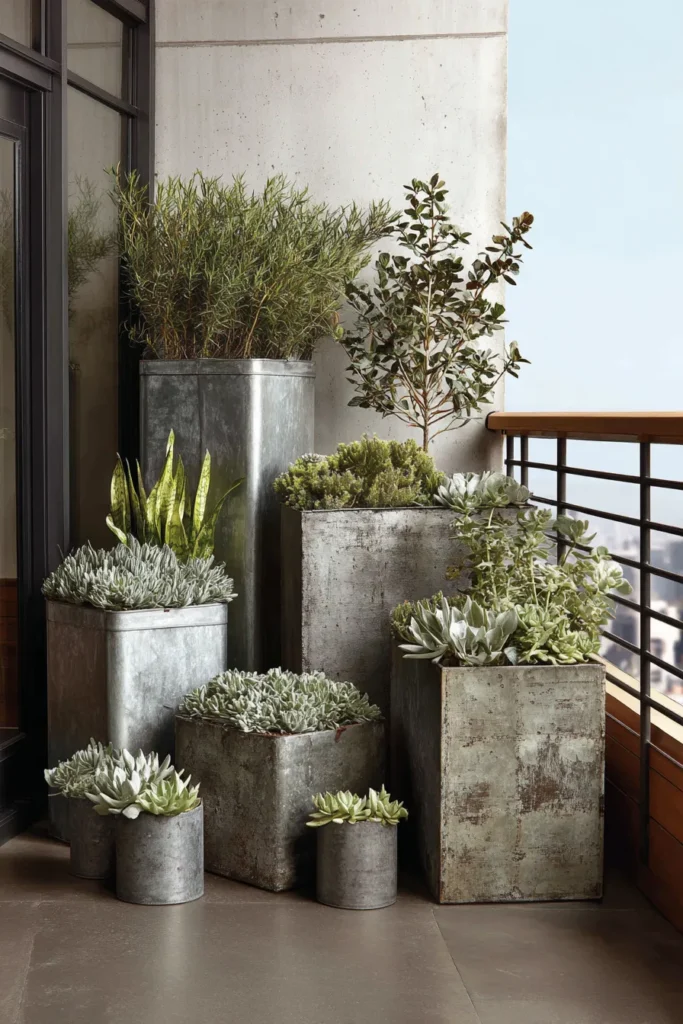 Designer’s Secret: Galvanized planters look cheap when brand new. Accelerate patina development by misting them nightly with a 1:1 vinegar-water solution for two weeks. This controlled oxidation creates the aged industrial look immediately rather than waiting 6-12 months for natural weathering. Supplement with self-watering railing planters in matching steel-look finishes.