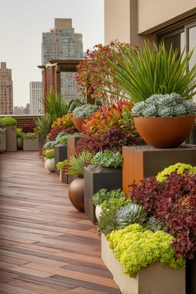 - Plant selection: Silver-green succulents and sage to complement metal tones