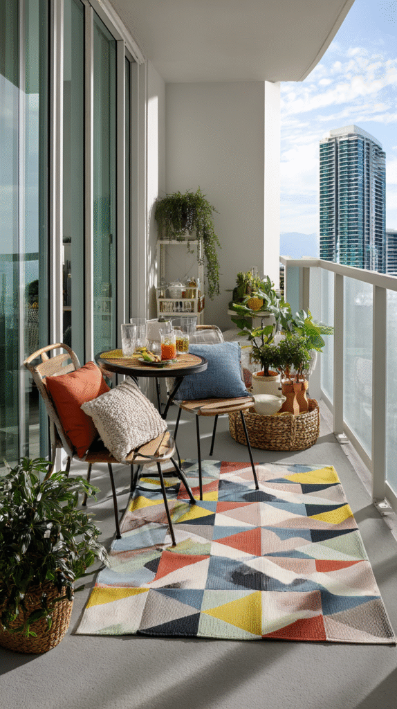 Here’s something most people overlook: an outdoor rug completely transforms how your balcony feels. It adds warmth, defines the seating area, and makes concrete floors look intentional instead of industrial.