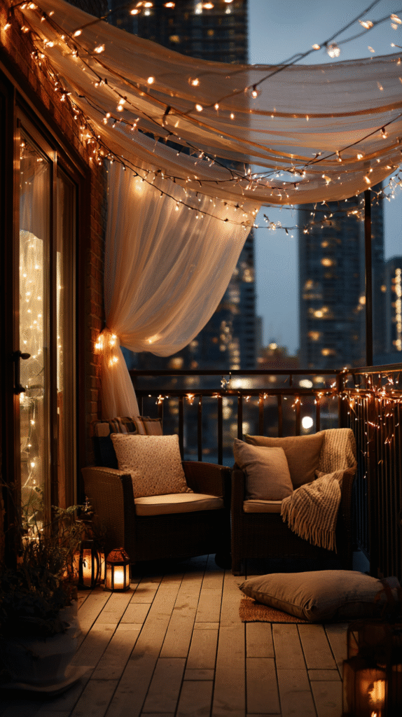 Want to know the fastest way to make your balcony feel magical? String lights. Seriously, this is the easiest balcony ideas apartment makeover that delivers maximum impact with minimal effort. One strand of lights and suddenly you’ve got yourself a cozy evening hangout spot.