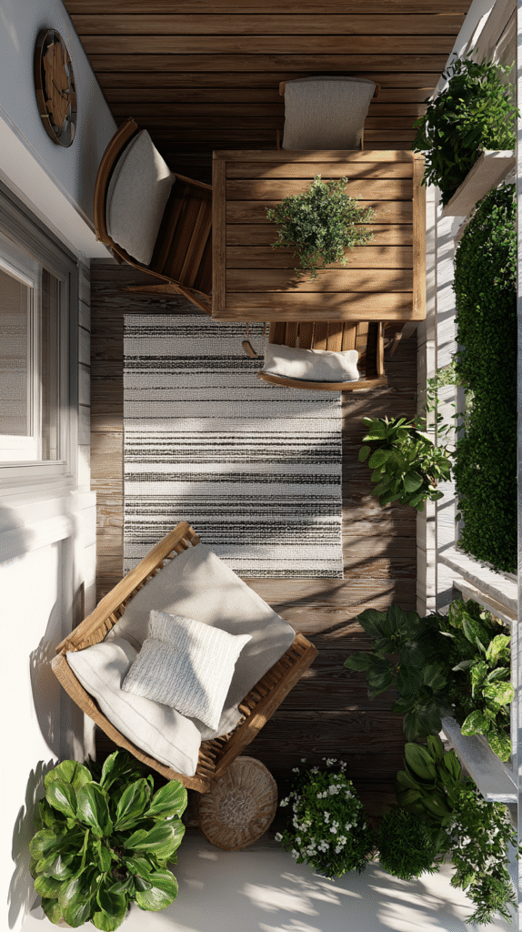 Even on a small balcony, defining different zones makes the space feel larger and more intentional. It’s all about smart planning and visual separation.