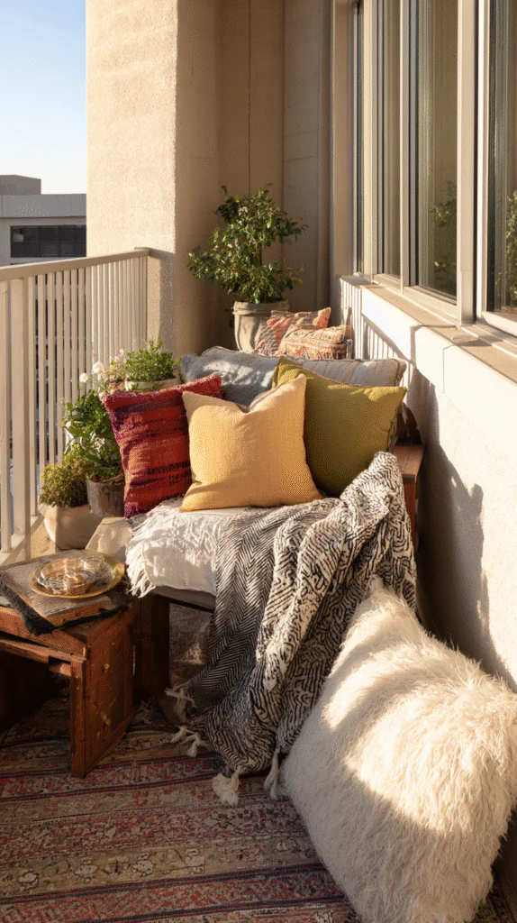 Want to make your balcony feel less “outdoor furniture catalog” and more “your favorite room”? Textiles are the answer. Cushions, throw pillows, and blankets turn a basic setup into something genuinely inviting.