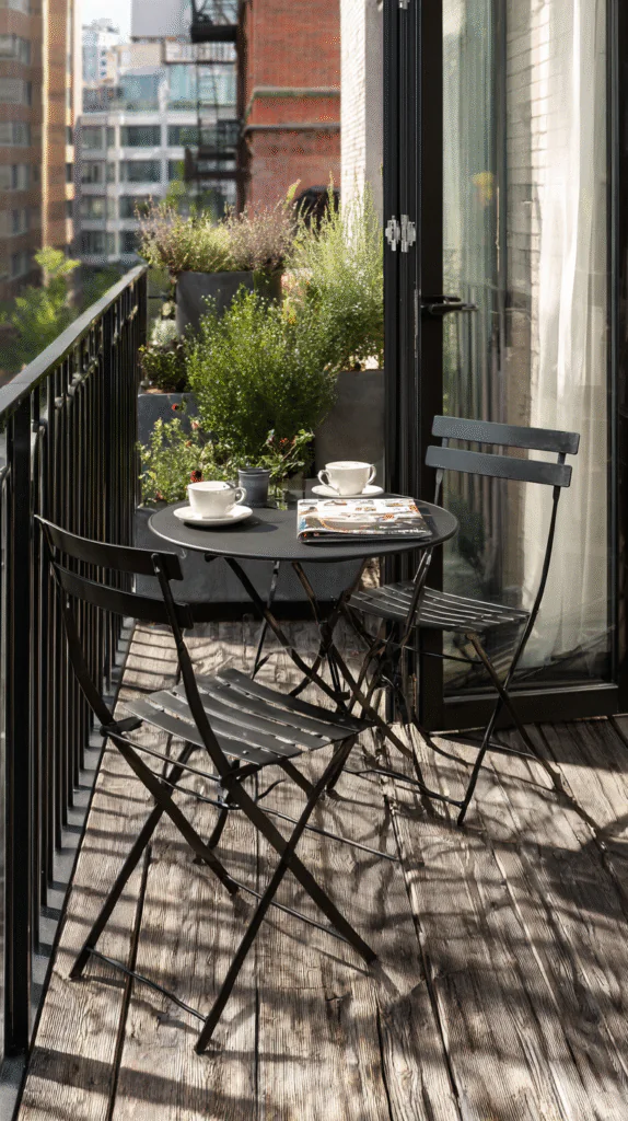 Let’s talk furniture. A compact bistro set is non-negotiable for making your balcony actually functional. We’re talking about a small table and two chairs that fold up when not in use—the MVPs of balcony ideas apartment residents swear by.