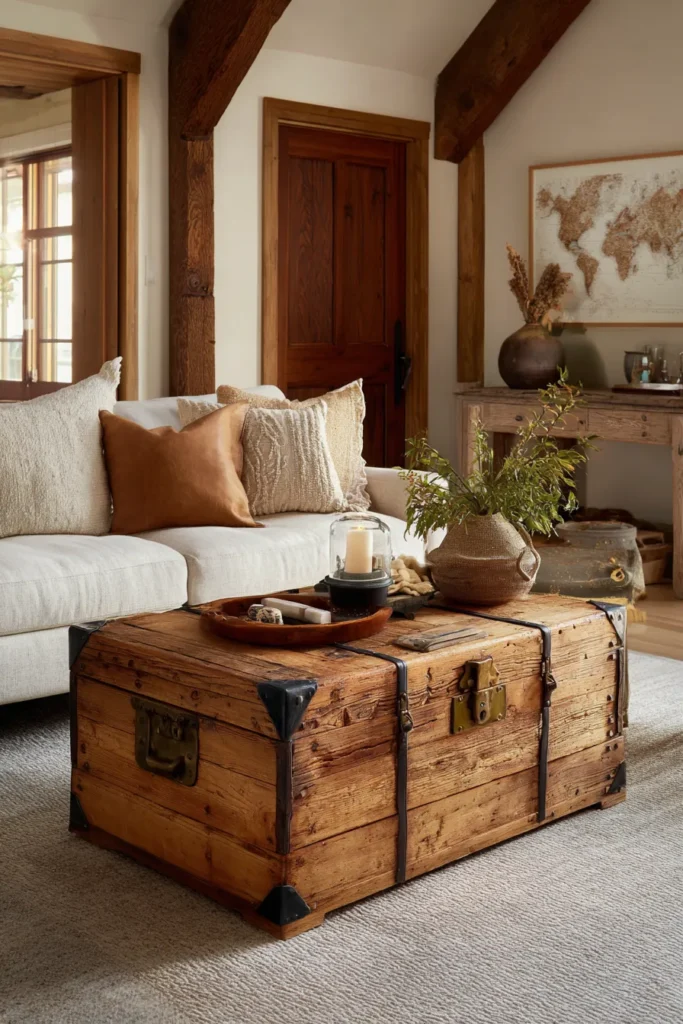 Authentic vintage trunks converted to coffee tables command premium pricing, but contemporary reproductions achieve similar patina through accelerated oxidation processes and distressed finishing techniques.