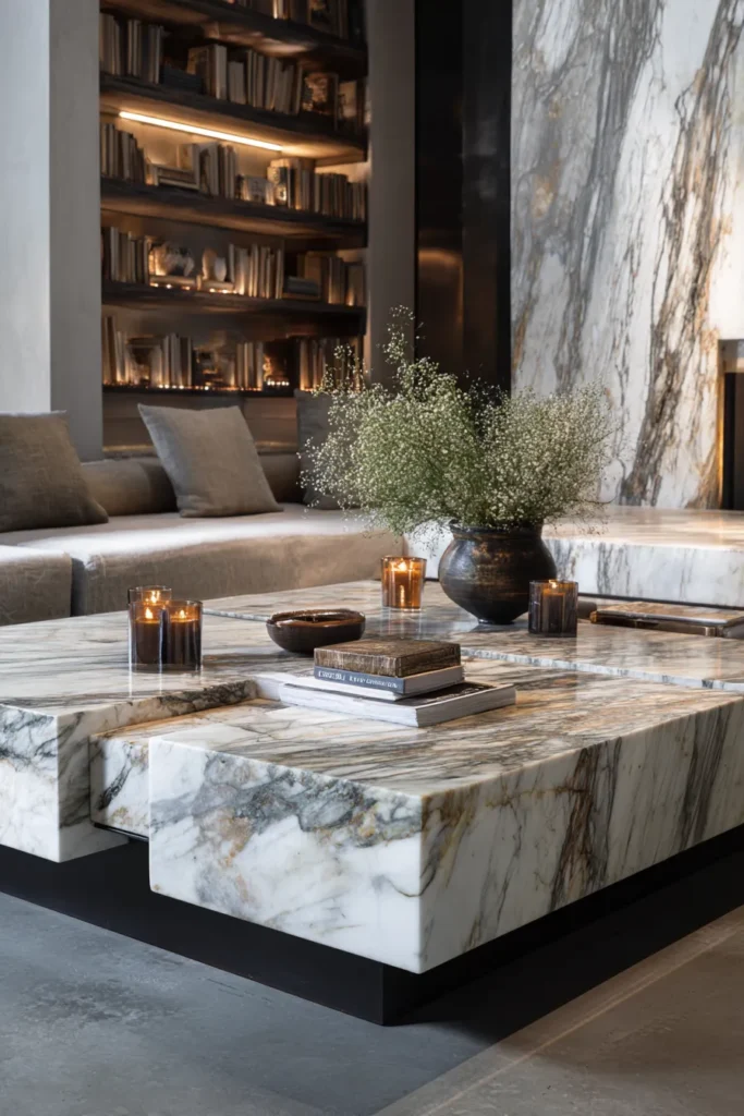 Carved travertine and terrazzo tables represent the apex of material investment—where storage voids become architectural excavations. These pieces weigh 150+ pounds, creating psychological permanence that anchors a room’s spatial hierarchy.