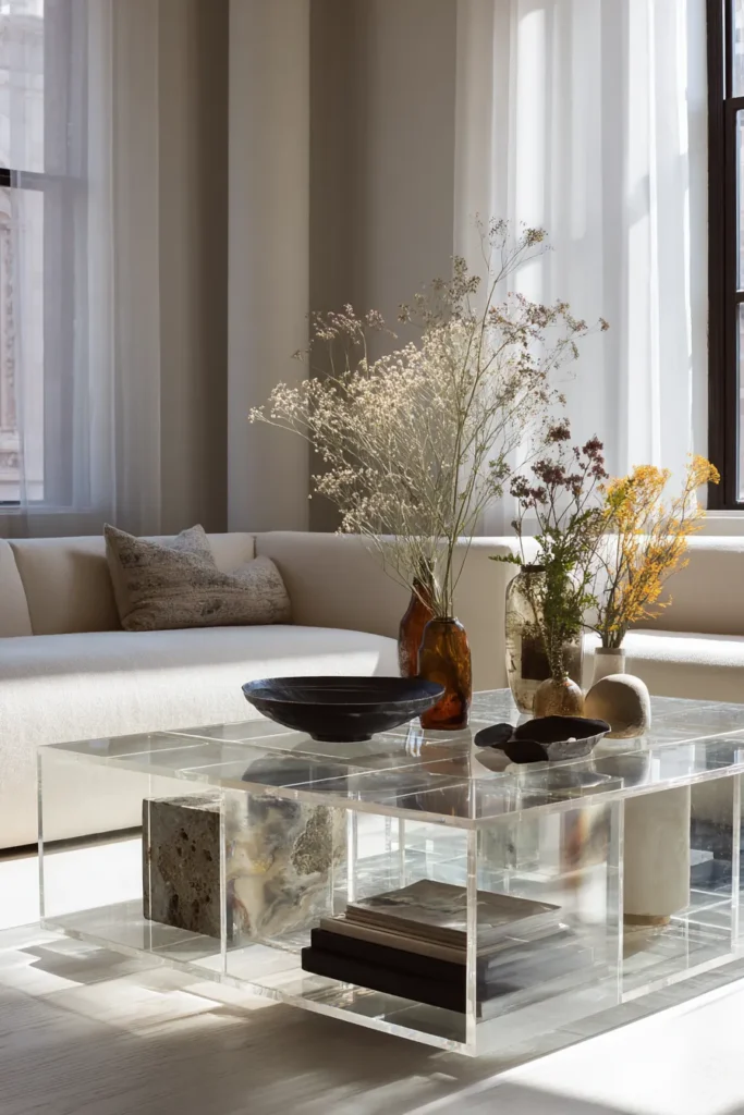 In direct opposition to concealment culture, 2026’s acrylic compartment tables transform storage into intentional exhibition—think museum vitrine meets residential utility. These pieces use 1/2-inch optically-clear acrylic to create geometric chambers where curated objects become part of the furniture’s visual identity.