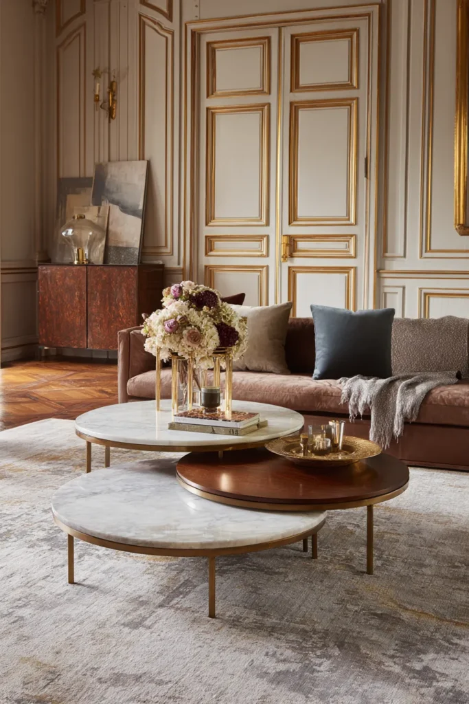 Designer’s Secret: Ensure the nested tables use three distinct materials rather than matching finishes. Pair walnut base with marble middle and brass-framed glass top to create “material storytelling” where each tier represents different design eras or geographic influences.