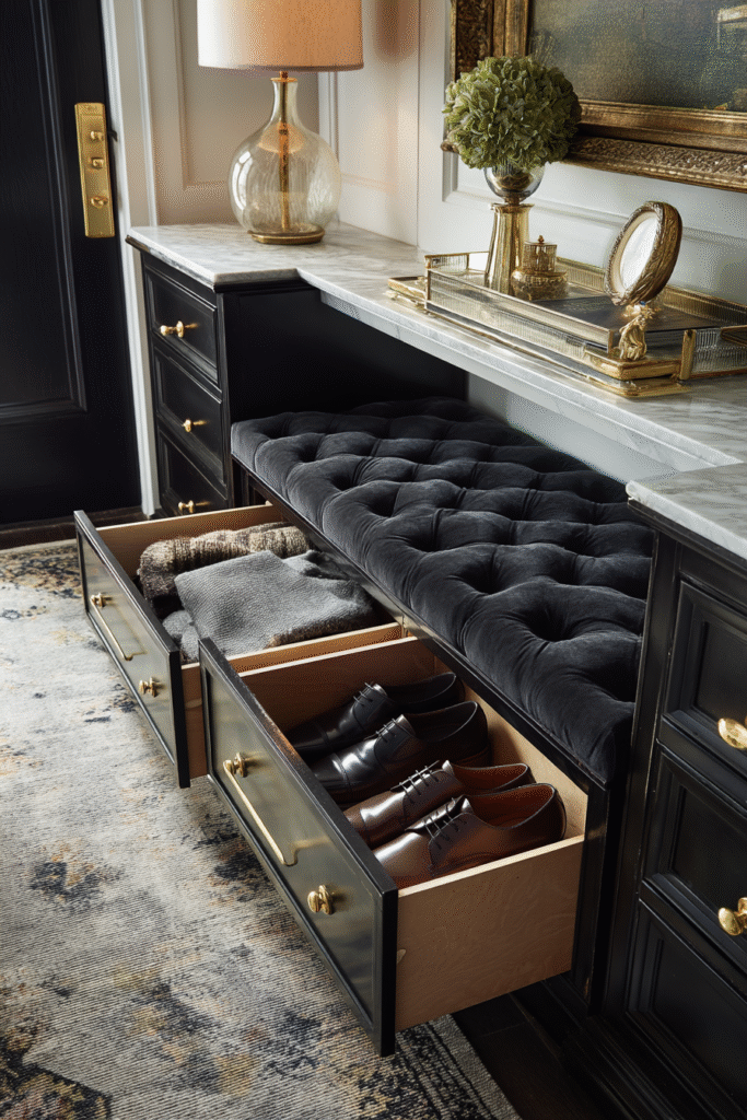 This bench style brings formality and refinement to entryways, working beautifully in traditional, glam, or transitional homes where details matter and furniture makes deliberate design statements. The tufted surface invites touch and creates visual interest even from across the room, while the hidden drawer storage keeps the practical shoe clutter completely concealed. The dual functionality means you’re not sacrificing comfort for organization—both coexist elegantly. These benches often become favorite perching spots for quick phone calls, parcel sorting, or simply pausing to appreciate the beauty of a well-appointed space. It’s the kind of furniture that makes everyday moments feel a bit more special.