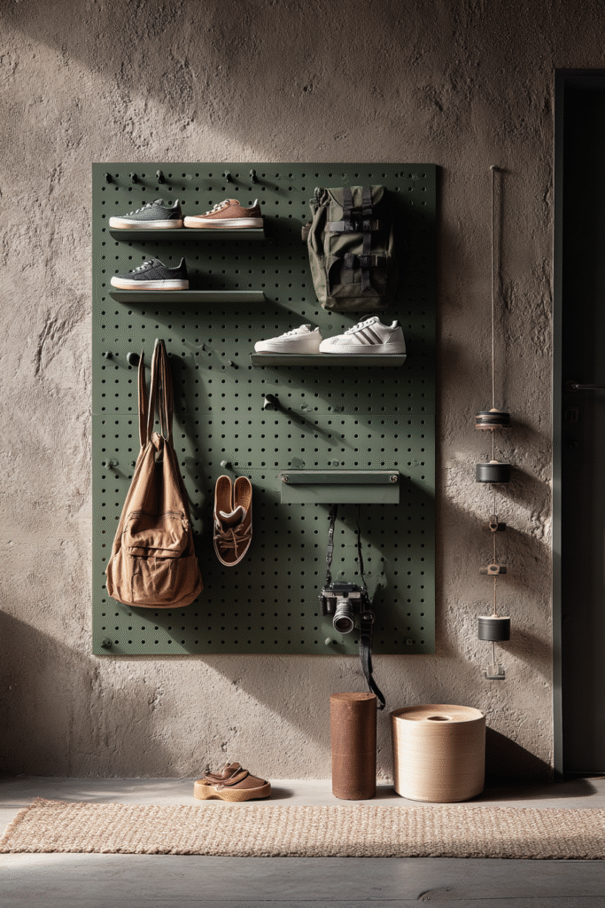 The pegboard wall system transforms shoe storage into an interactive, customizable display where every pair hangs or rests on hooks and shelves that you can rearrange at will. Originally a garage workshop staple, pegboard has been reclaimed by design-forward homes as a flexible, graphic solution that looks intentionally industrial-chic. The perforated panel—painted in bold colors or left in natural wood tones—mounts to your wall and accepts an array of accessories: S-hooks for hanging shoes by their heels, small shelves for displaying sneakers, baskets for sandals, or even clips for accessories. The grid pattern creates visual structure and rhythm, making even a diverse shoe collection look organized and considered.