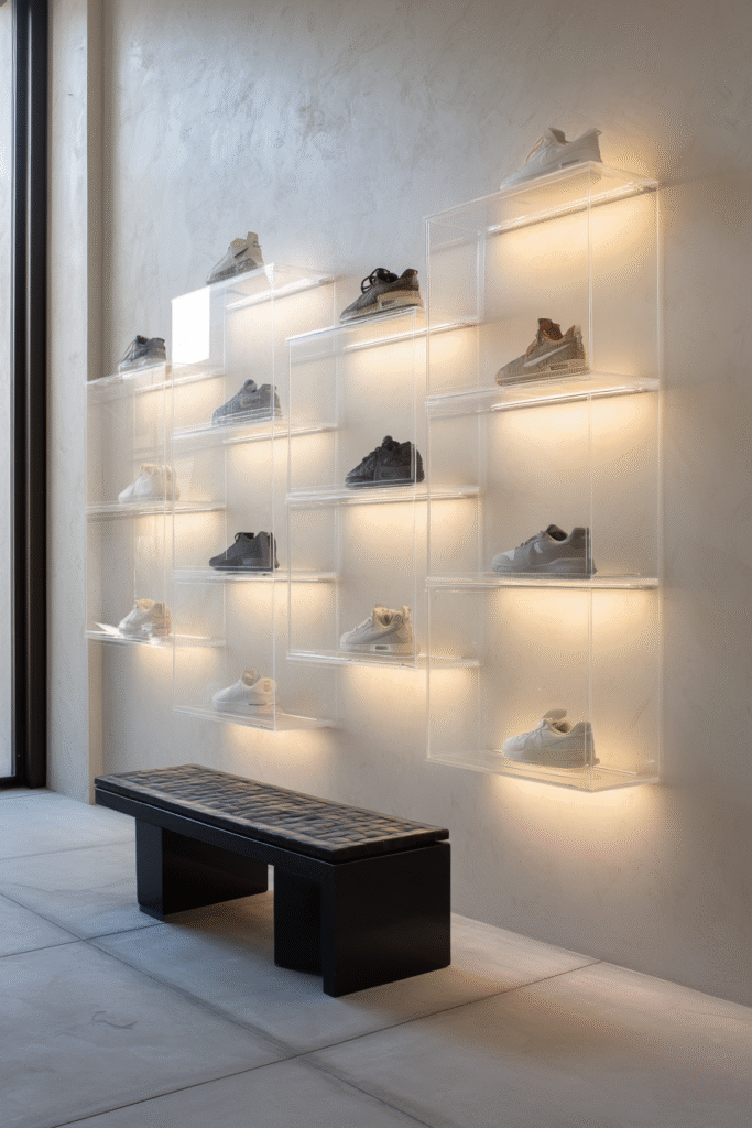 This display method works spectacularly in modern, contemporary, or minimalist spaces where clean lines and transparency are design values. It’s particularly popular among sneaker enthusiasts with curated collections of rare or designer pairs that represent significant cultural or personal value. The protected display keeps shoes pristine while allowing you to appreciate them daily, turning your entryway into a personal gallery. The modular nature of acrylic displays means you can start with a few boxes and expand as your collection grows, creating wall compositions that evolve with your tastes. It’s storage that celebrates rather than conceals, transforming functional necessity into intentional design expression.