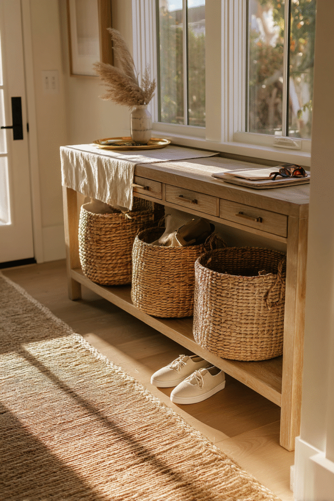 - Measure your console table’s shelf height to ensure baskets fit with a few inches of clearance