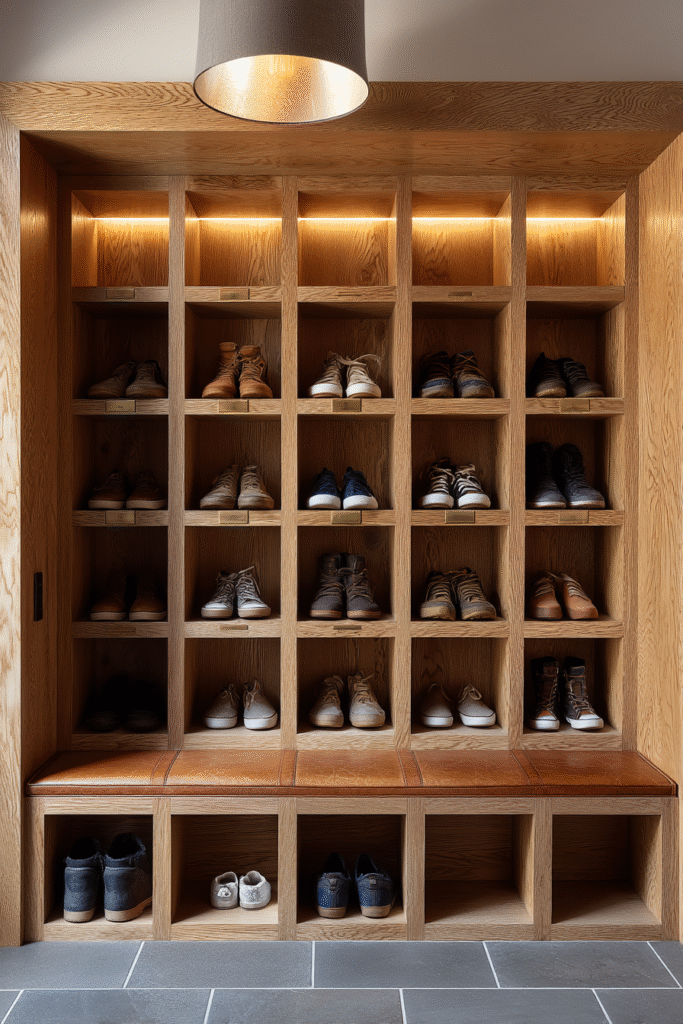 This built-in approach is particularly powerful in mudrooms or larger entryways where you have vertical wall space to work with. The natural wood finish—whether oak, walnut, or pine—brings warmth and texture that contrasts beautifully with painted walls or tile floors. It’s a solution that grows with you: assign cubbies to family members, rotate seasonal shoes in and out, or use some compartments for accessories like scarves or hats. The permanence of built-ins signals investment in your home’s functionality and beauty, creating a space that feels both practical and heirloom-worthy.