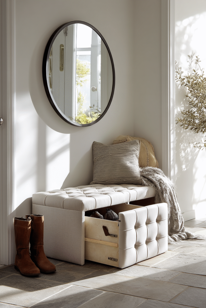 An upholstered storage bench does double duty with such grace—it’s where you sit to pull on your shoes in the morning and where those same shoes disappear when you’re done. The padded seat lifts to reveal a spacious hollow interior, deep enough to hold a dozen pairs while keeping them completely hidden from view. Wrapped in linen, velvet, or textured fabric, these benches feel more like elegant furniture than utilitarian storage, adding softness and comfort to an area that’s often dominated by hard surfaces. The lifted seat closes with a gentle drop, and suddenly your entryway looks curated and clutter-free, with no evidence of the organizational magic happening inside.