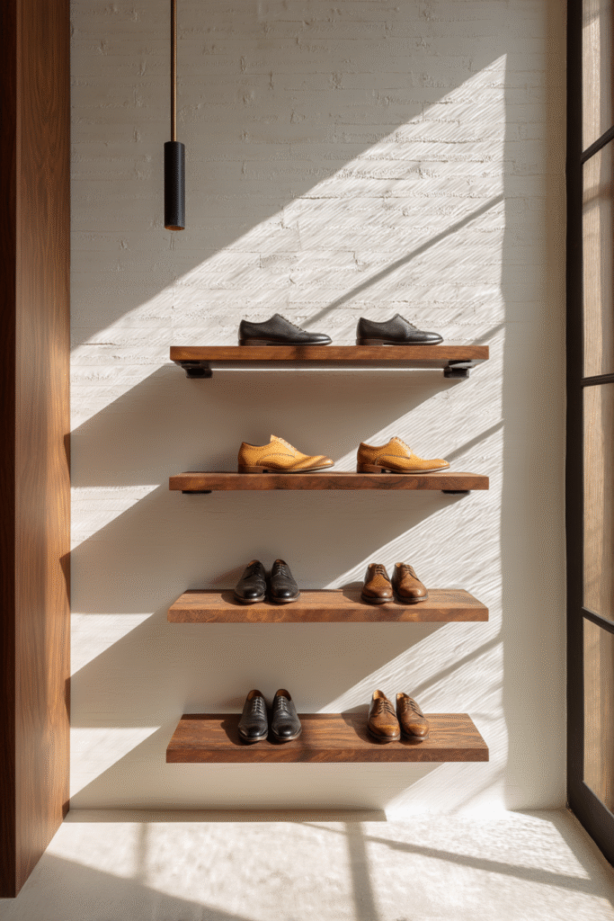 This approach transforms shoe storage into a curated display, working especially well for those who invest in beautiful footwear and want to show it off. The open design ensures proper air circulation, preventing moisture buildup and keeping shoes fresh between wears. Floating shelves also offer incredible flexibility—you can arrange them in geometric patterns, stagger them asymmetrically, or stack them in neat columns depending on your aesthetic preferences. It’s storage that celebrates rather than conceals, perfect for design lovers who appreciate the sculptural quality of well-made shoes and want their entryway to reflect that appreciation.