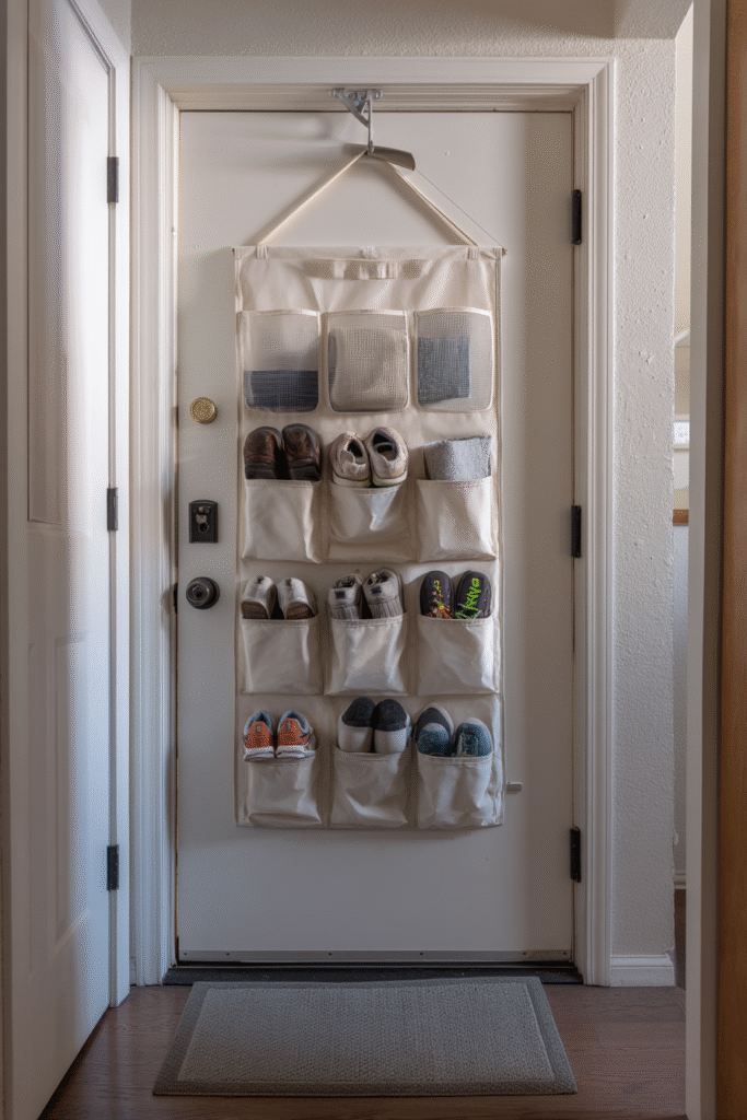 The over-the-door shoe organizer is the ultimate space-saver for entryways with literally no floor space to spare—it hangs on the back of your front door, transforming an otherwise unused surface into instant storage for 12 to 24 pairs of shoes. Made from canvas, polyester, or mesh fabric with individual pockets, this solution keeps shoes contained and visible while taking up zero precious square footage. Each pocket holds a single pair, creating a vertical grid that makes finding the right shoes effortless, even during rushed morning departures. The soft fabric construction means it won’t damage your door, and when you close the door, all that storage simply disappears from view.