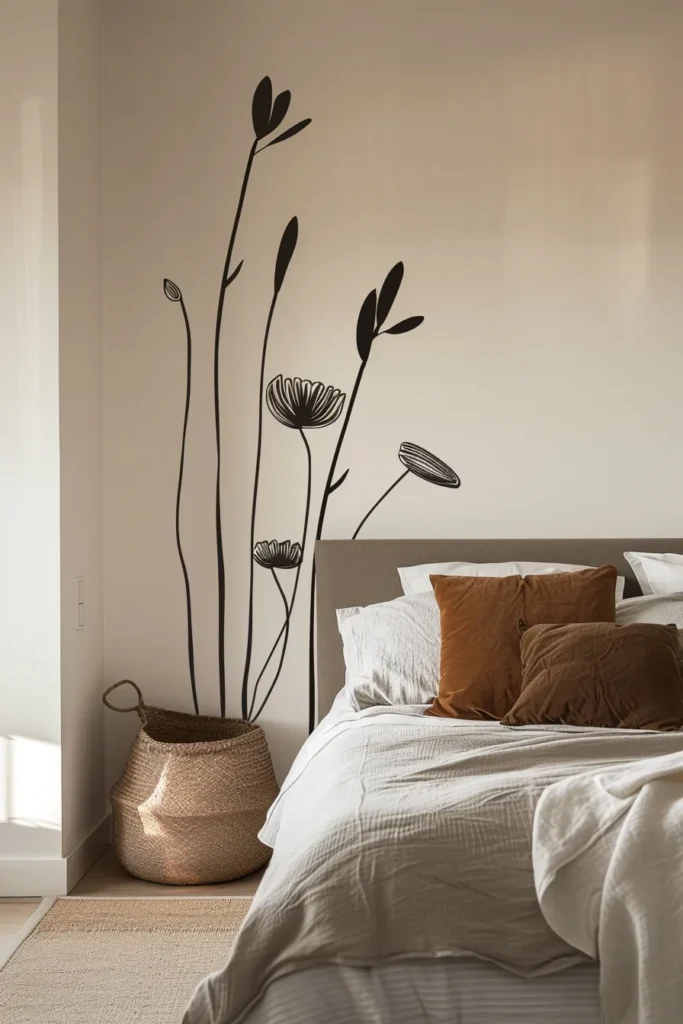 Solid-color cutouts in deep charcoal, navy, or sage create shadow-like presences that add depth without busy pattern. Oversized single motifs (48-72 inches tall) behind beds or dressers anchor furniture groupings and create focal points in otherwise neutral schemes.