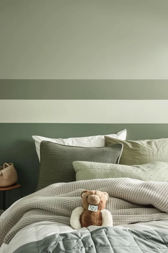 Three equal 18-inch stripes create balanced, gallery-like sophistication. Use this configuration with tonal progressions (pale sage, mid sage, deep olive) for subtle dimensional effect that doesn’t overwhelm small spaces.