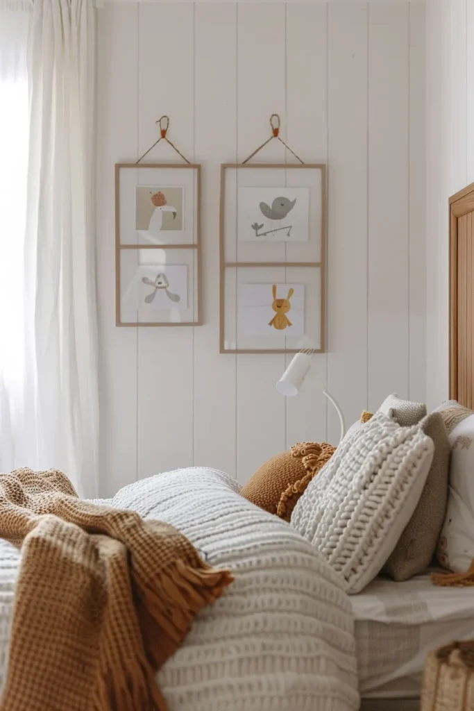 Designer’s Secret: Install a continuous picture rail (crown molding with integrated groove or dedicated gallery rail) 12 inches below ceiling line. Use adjustable hanging cables with precision hooks to suspend frames—this allows rearrangement without new nail holes. For young children’s art, standardize on 11×14-inch frames with pre-cut mats (regardless of artwork size) to create visual cohesion despite varying art dimensions. Purchase frames in bulk (20+ identical frames) and rotate art seasonally while maintaining consistent frame style for gallery-quality presentation.