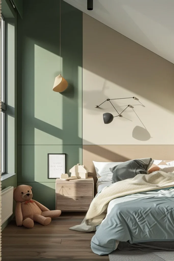 Best For: Kids bedroom designs for boys who gravitate toward bold graphics, or minimalist parents seeking geometric interest without pattern complexity.