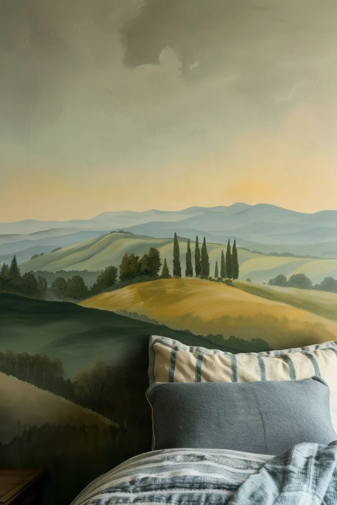 Painting a continuous horizon at 48-60 inches (typically two-thirds up the wall) with sky gradient above and ground elements below creates the perception of windows where none exist. Subtle cloud formations, distant mountains, or rolling hills provide meditative focal points that don’t demand attention but reward observation.
