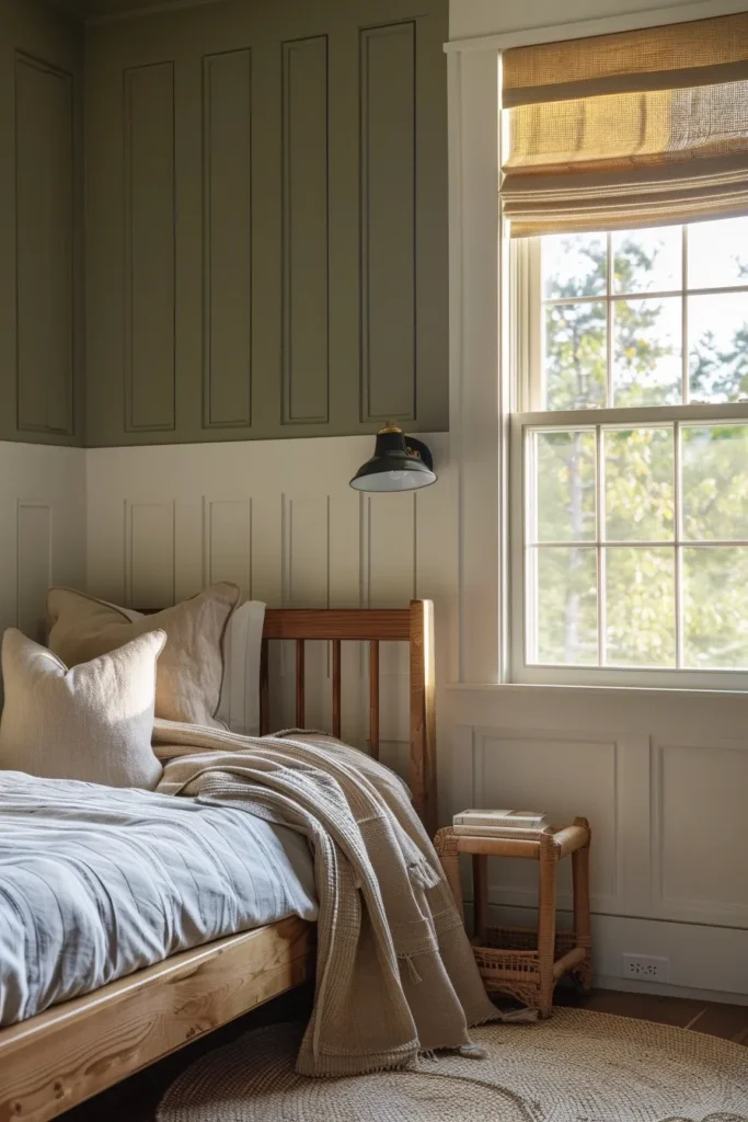 Dividing walls horizontally at 42-48 inches (chair rail height) grounds the room and creates a visual “weight” at the bottom third that makes ceilings feel taller. Darker tones below, lighter above—this ratio mimics natural landscape horizons that human eyes find inherently calming.