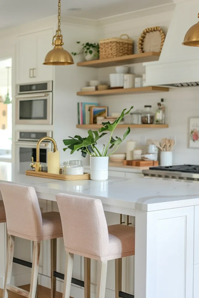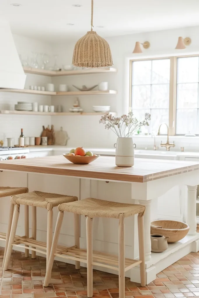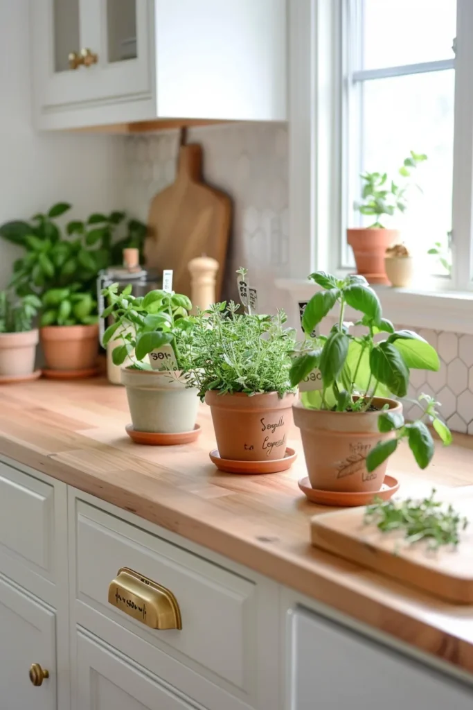 Line the counter edge of your island — or a small shelf attached to one end — with terracotta pots of fresh herbs. Basil, rosemary, thyme, a trailing pothos for the drama of it. It brings nature right into your cooking, smells incredible, and gives the kitchen that lived-in and loved quality that you can’t fake with decor.