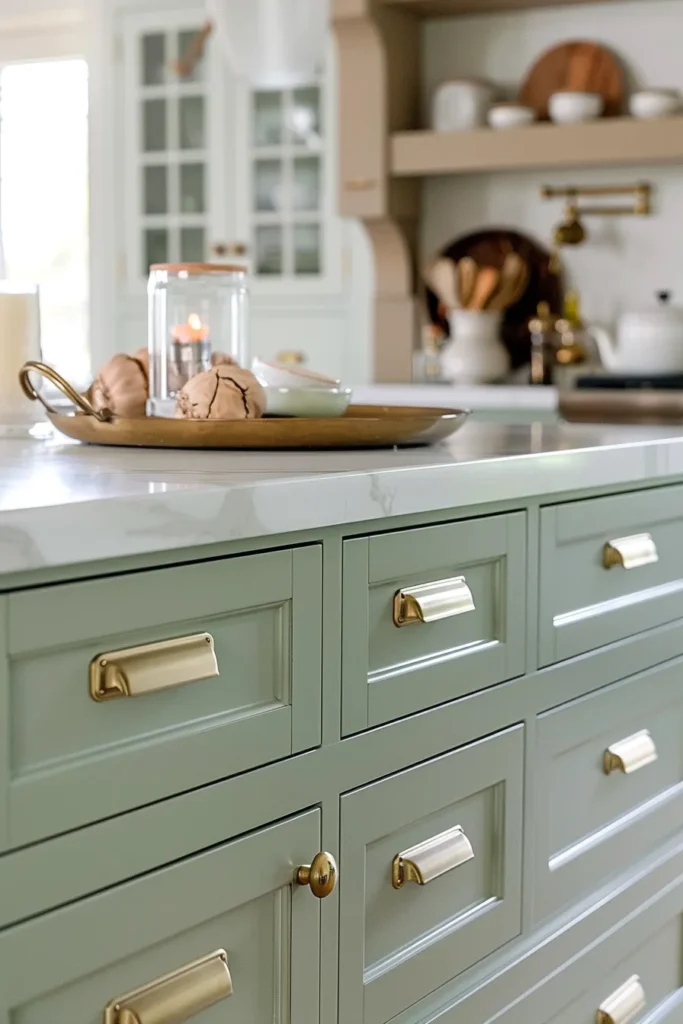 Try dusty sage green, warm terracotta, or a deep navy on just the island while the surrounding cabinets stay in a creamy white. The contrast creates a focal point and adds that pop of personality that makes a kitchen feel like yours. Brass hardware on the colored island, white knobs on the perimeter — and suddenly your kitchen has a whole personality it didn’t have before.
