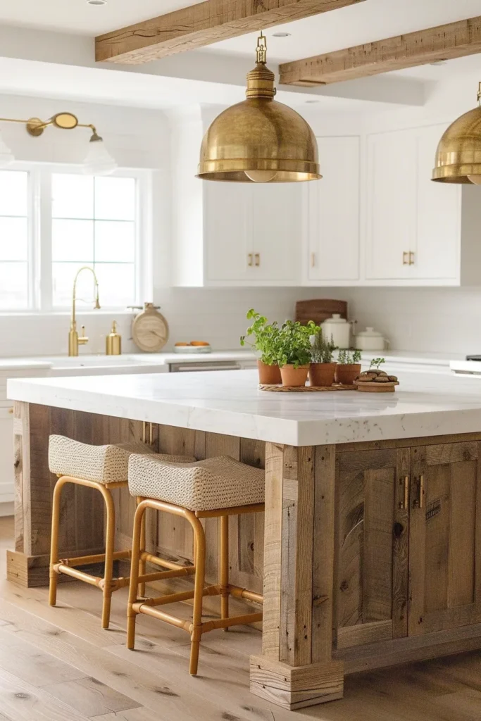 Okay so I resisted this one for ages because I thought reclaimed wood would feel too rustic, too Pinterest-farmhouse-2016. But here’s what nobody tells you — when you pair a weathered wood island base with white shaker cabinets and a marble countertop, it doesn’t look rustic at all. It looks collected. Like your kitchen has a history.