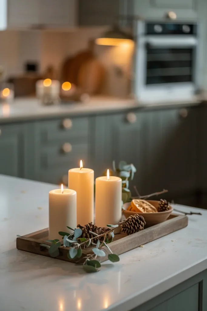 This one costs almost nothing and makes a disproportionate difference. Group three candles of different heights on a small wooden board or marble tray at one end of the island. Add a dried eucalyptus sprig, a small ceramic bowl with something seasonal in it — pinecones right now, a lemon in summer.