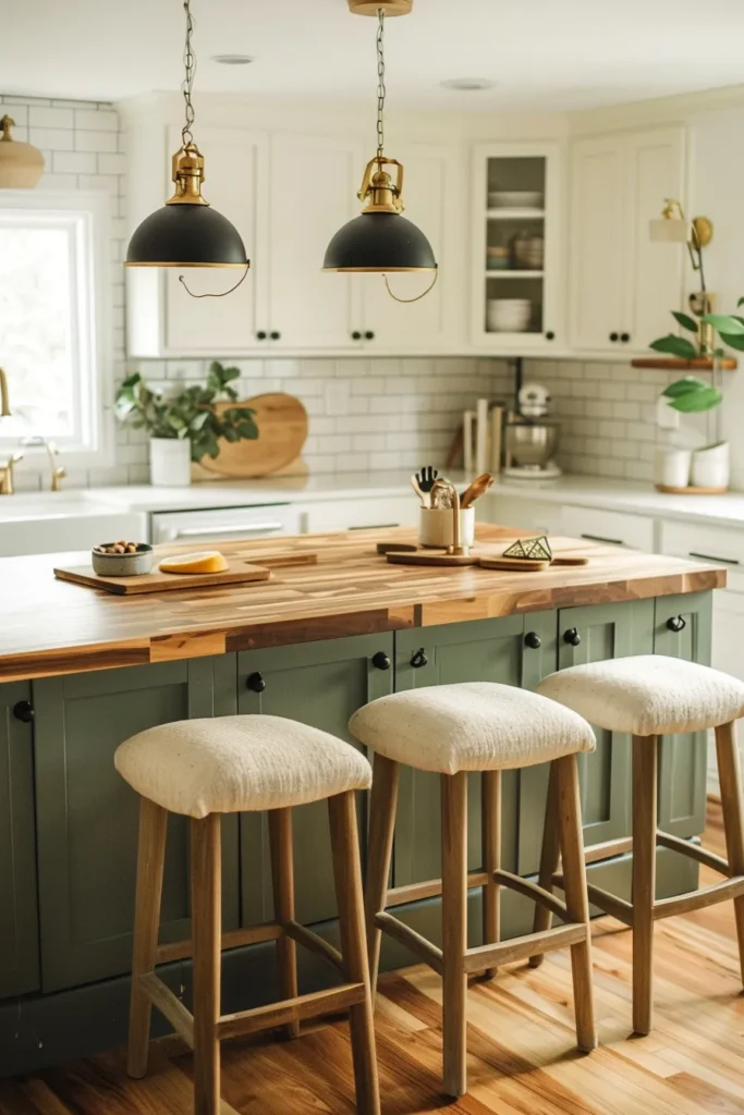 For smaller kitchens or open-plan layouts, this one is kind of magic. Instead of a solid cabinet base, the island has four slim tapered legs — like a table — with a butcher block or wooden top above. No lower cabinets. Just open space underneath.