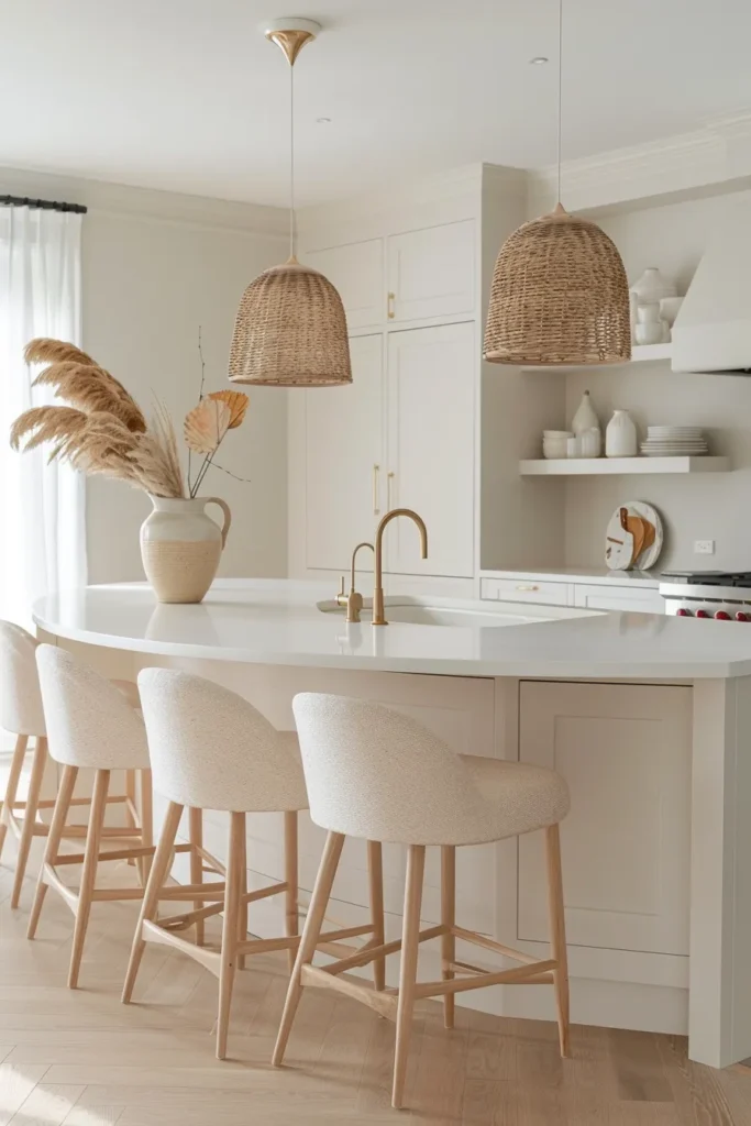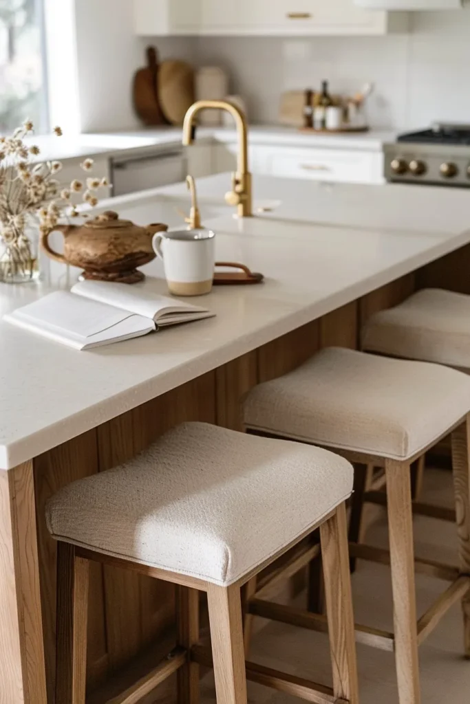 The stools you choose are doing more work than you think. Swap out generic wooden or metal stools for upholstered ones in bouclé or linen — creamy white, warm oatmeal, dusty rose — and the whole island goes from functional to inviting.
