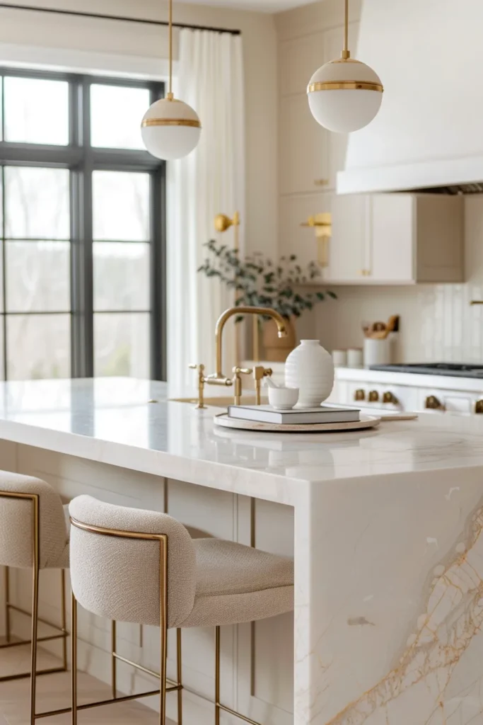 Warm ivory or soft grey quartz with a waterfall edge has this seamless, sculptural quality that genuinely elevates the whole kitchen without you changing anything else. If you’re doing one splurge item on your island, this is the one I’d pick every time.