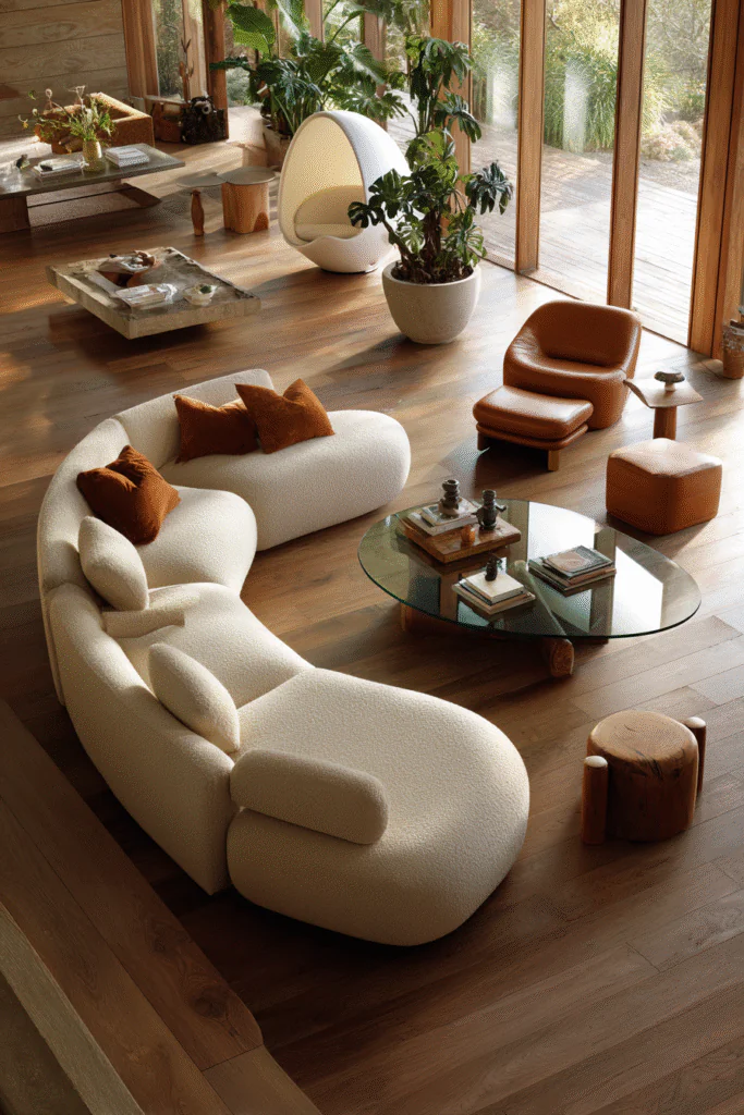 A curved sectional sofa in a rich velvet or bouclé fabric immediately signals 70s modern. Pair it with a low-profile coffee table in natural wood or smoked glass. Add a sculptural egg chair or womb chair for that perfect retro accent piece.