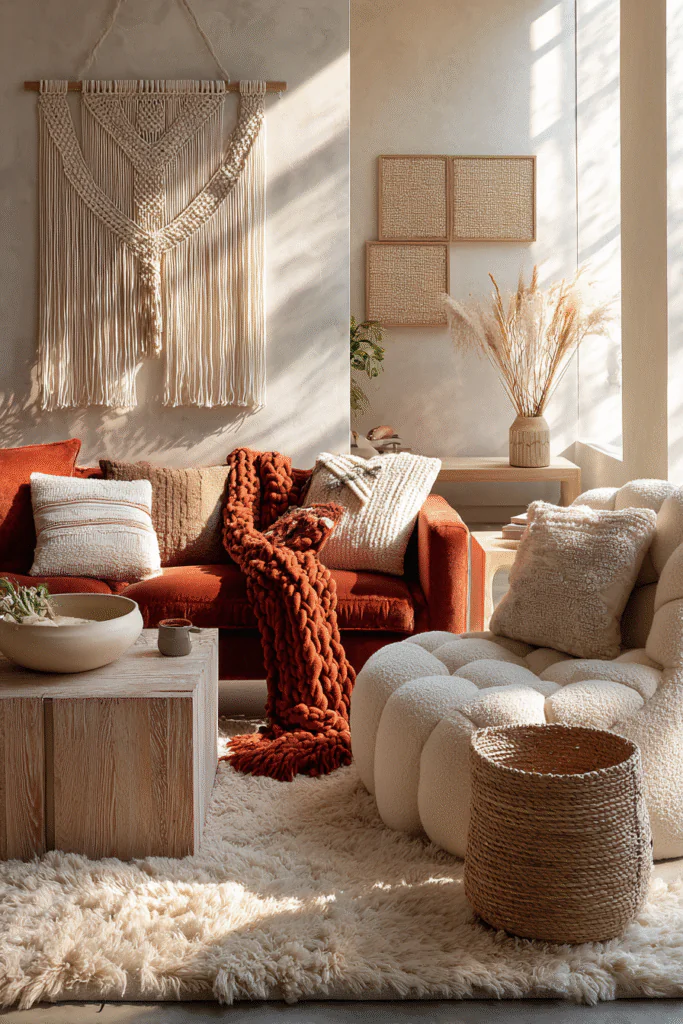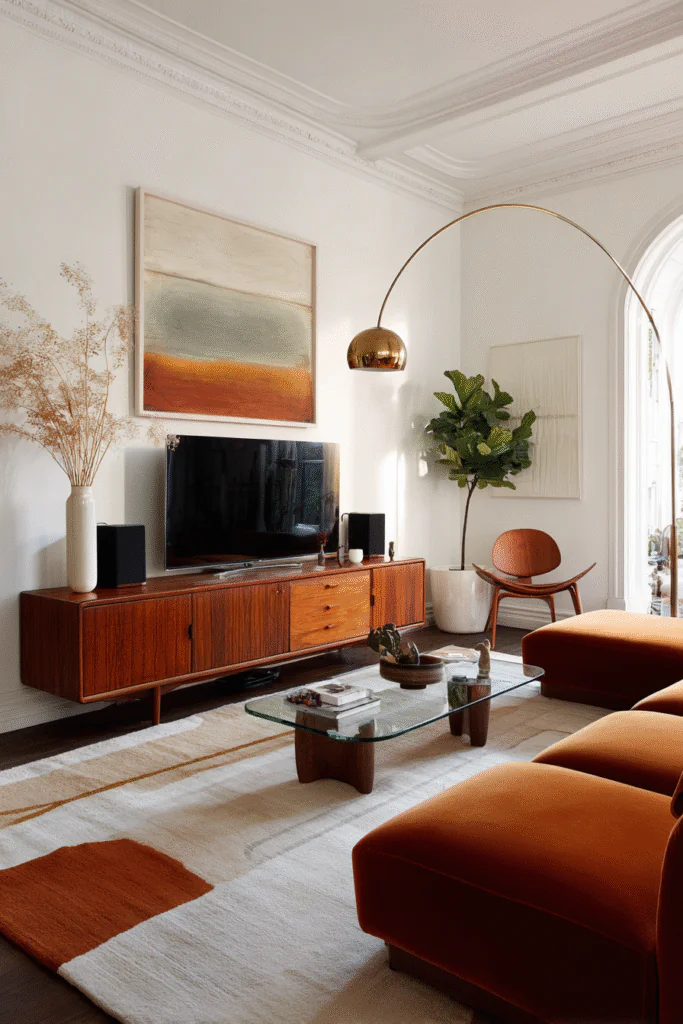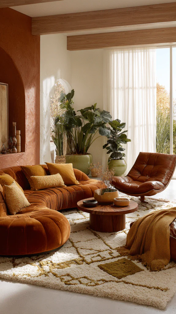 FYI, you don’t need to commit 100% to pull this off. Start small—add a burnt orange throw pillow, hang a macramé wall hanging, or bring in a vintage brass arc lamp. See how it feels. If you love it, layer in more elements gradually. Your living room should evolve naturally rather than being an overnight transformation.