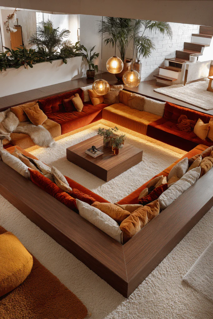 If you’re building or doing major renovations, a conversation pit creates an unforgettable focal point. Modern versions are often less dramatically sunken and feature built-in seating with plush cushions surrounding a low central table.