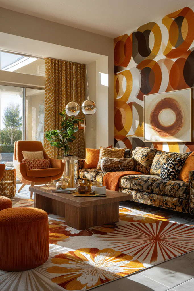 The 70s weren’t shy about pattern mixing. Geometric prints, organic florals, paisley, and abstract designs appeared on everything from wallpaper to upholstery to rugs. The key was confidence—patterns were bold, large-scale, and unapologetic.