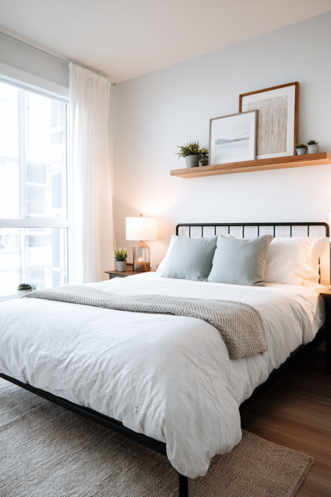 Budget minimalism proves that minimalist aesthetic and peaceful uncluttered bedroom are achievable at any price point through strategic priorities, creative solutions, and recognition that minimalism’s core principle—having less—actually supports limited budgets better than any other design style since the philosophy requires fewer purchases and celebrates simplicity over luxury. The foundation is ruthless decluttering which costs nothing but delivers immediate impact by removing everything unnecessary from the bedroom creating visual calm and spaciousness that no amount of furniture purchasing can match, making this the most important first step for budget minimalism. Furniture priorities should focus on one quality bed frame since you spend a third of your life sleeping making this worth investment even on tight budget, then creatively solving other furniture needs through DIY floating shelves replacing expensive nightstands, using simple boards on affordable brackets painted to match walls, repurposing existing furniture through paint and new hardware updating outdated pieces at fraction of replacement cost, and shopping second-hand through thrift stores, estate sales, and online marketplaces for solid wood furniture that can be refinished. Paint becomes primary design tool since it’s the most affordable way to completely transform a space where quality white or light neutral paint from big-box stores costs minimal investment delivering maximum impact by making small rooms feel larger and creating cohesive backdrop for minimalist design. Bedding should prioritize clean basics over luxury fabrics where simple white or light gray cotton sheets and duvet covers from budget retailers like IKEA, Target, or Amazon Basics provide the minimalist aesthetic at accessible prices. Lighting can be simple and affordable through basic lamps from budget stores, string lights providing ambient glow for under $15, or even maximizing natural light as primary source during day. DIY projects stretch budgets significantly through creating floating shelves from basic lumber, making simple headboards from painted plywood or fabric, creating artwork through abstract painting or framing pages from old books, and refinishing thrifted furniture with paint and sandpaper.