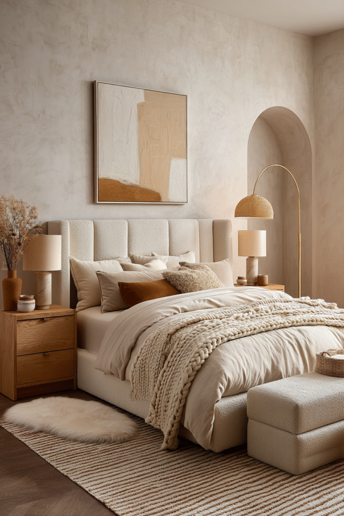 Warm minimalism addresses traditional minimalism’s coldness while maintaining uncluttered philosophy through textural variety within a cohesive color story. Select warm neutrals like cream, oat, sand, and terracotta that share similar undertones, then introduce maximum textural diversity where smooth percale contrasts with nubby linen, sleek velvet plays against chunky knits, and flat-weave rugs layer beneath plush sheepskins. Bouclé fabric has become the signature element bringing instant sophistication to platform beds and chairs. Lighting strategy matters with warm metallic fixtures in brass or copper adding subtle warmth while maintaining sleek lines. Wall treatments like limewash paint create organic surfaces that feel handcrafted. The key is restraint—each textured element needs breathing room where a chunky knit throw becomes a focal point when it’s the only item draped across the bed’s foot.
