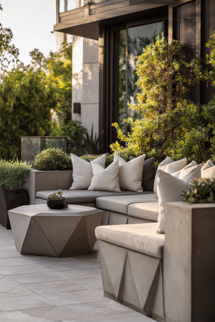 Contemporary outdoor design increasingly embraces material contrast—think the industrial edge of concrete paired with the softness of upholstered cushions. Picture a geometric concrete base forming a bench or low seating structure, topped with custom cushions in weather-resistant fabrics. The juxtaposition creates visual tension that feels modern and intentional, bringing architectural interest to outdoor spaces while maintaining comfort.