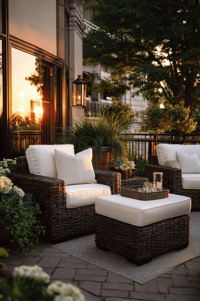 - Add a throw blanket draped over the edge for texture and cooler evening comfort