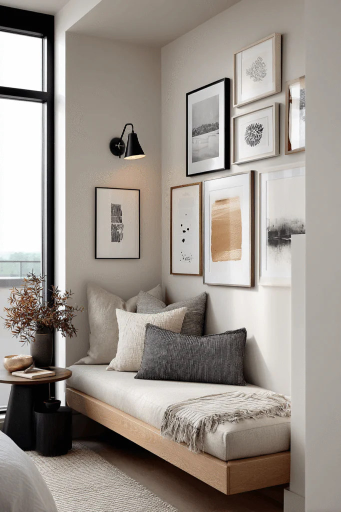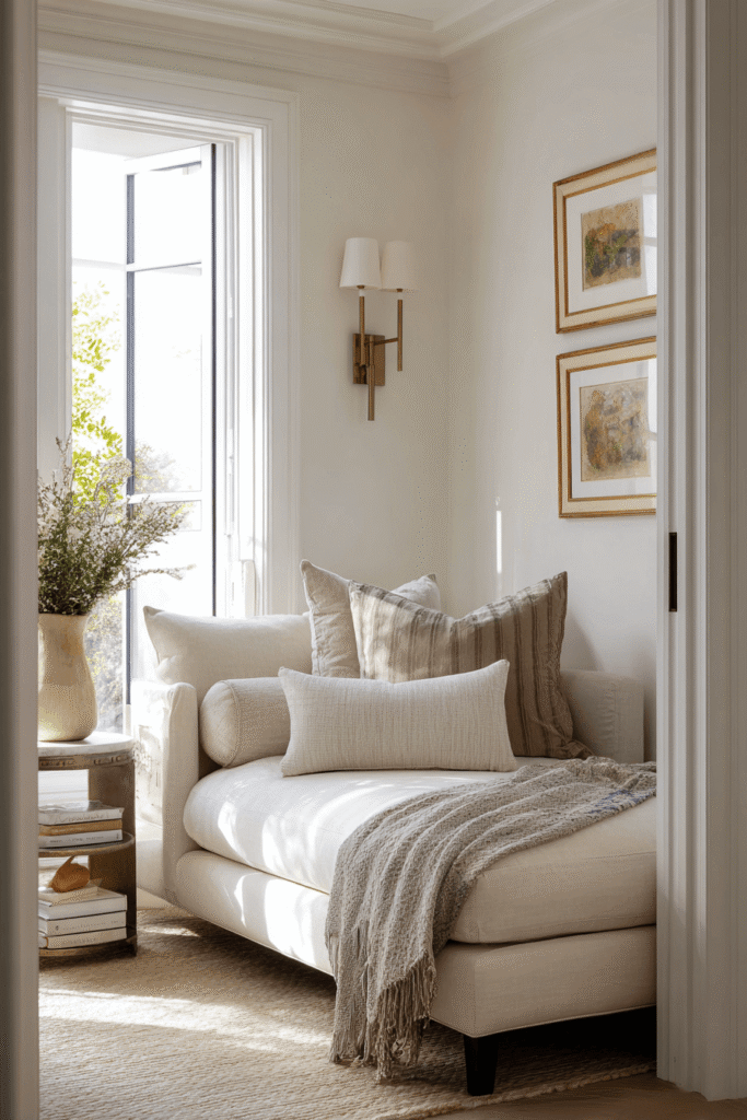Multi-functional luxury transforms corners into dual-purpose spaces where reading and lounging coexist beautifully. A daybed provides the seating depth and cushioning of a bed with the backrest functionality of a sofa—perfect for extended reading sessions that might drift into afternoon naps. Styled with bolster pillows along the back, this setup creates comfortable support for upright reading while maintaining an elegant, tailored appearance.