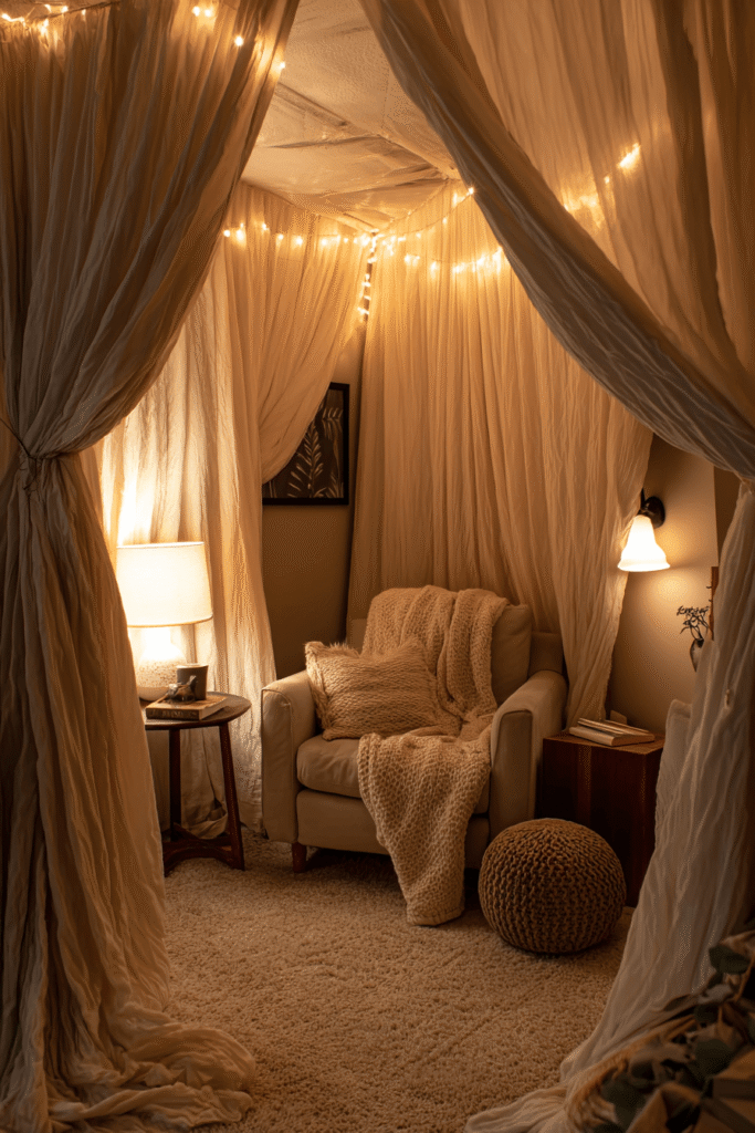 - Position comfortable seating—chair, floor cushions, or small loveseat—within the canopy space