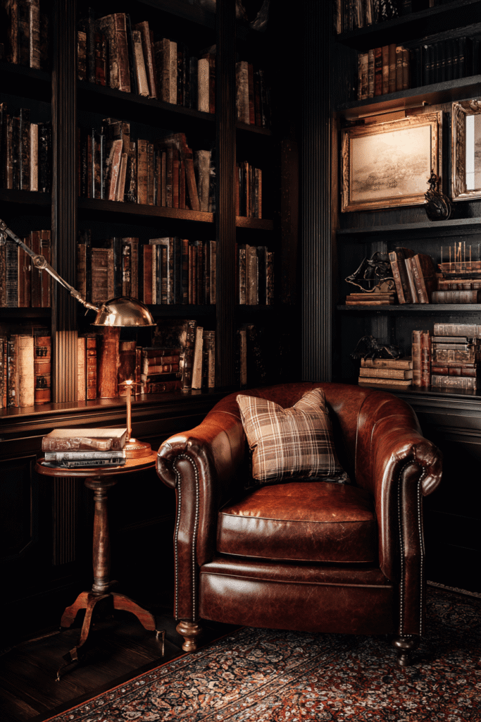 - Hang framed artwork or vintage maps on adjacent walls to complete the library aesthetic