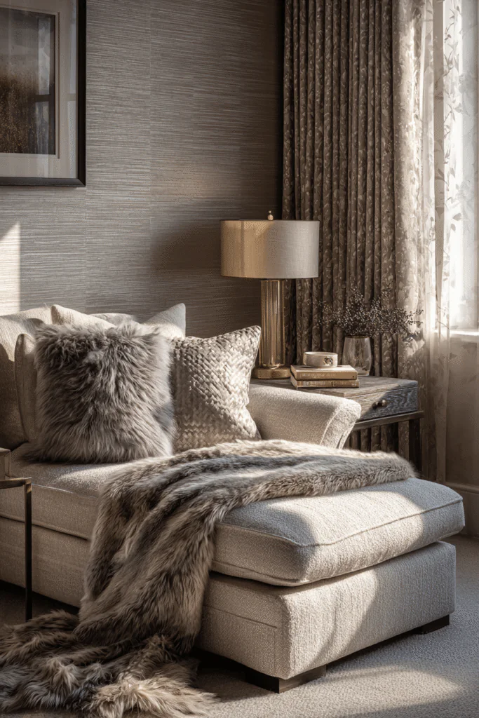 - Add a textured area rug beneath the chaise to anchor the reading zone